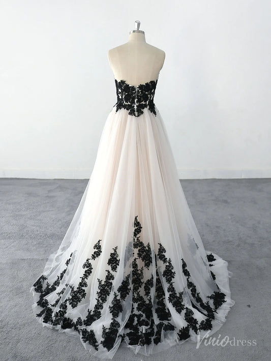 Elegant Black Lace Strapless Wedding Dress with Sweetheart Neckline, Nude Lining, and Tulle Skirt – BK120