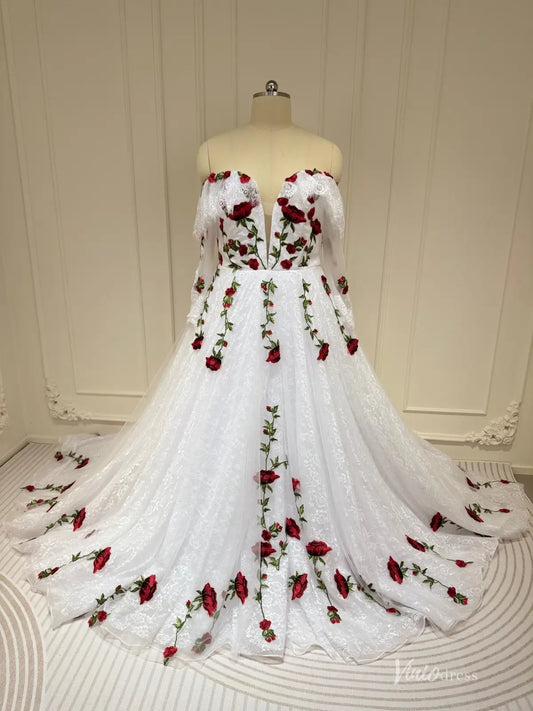 Off the Shoulder Rose Floral Lace Wedding Dress with Long Sleeve,Red Embroidered Appliqués, Corset Back FD1046