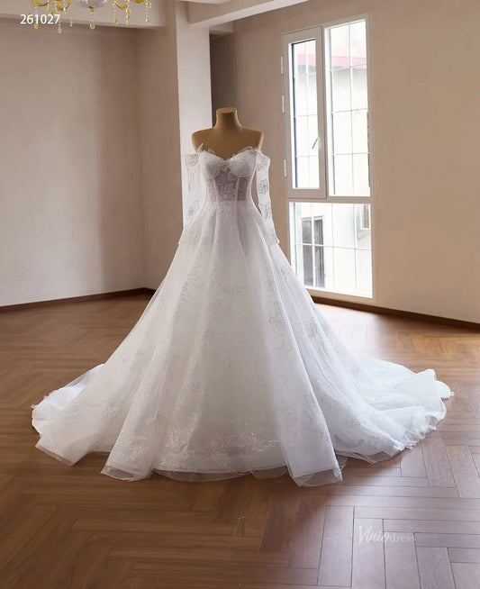 Ivory Romantic Ball Gown Wedding Dress with Sheer Corset, Floral Lace and Off Shoulder Sleeves – 261027