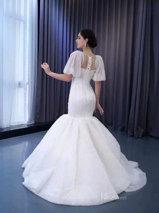 Mermaid Pearl Wedding Dresses Puffed Sleeve Bridal Dress 222238