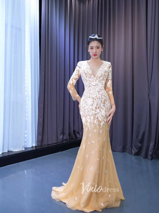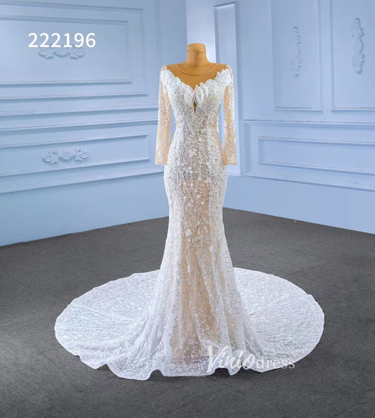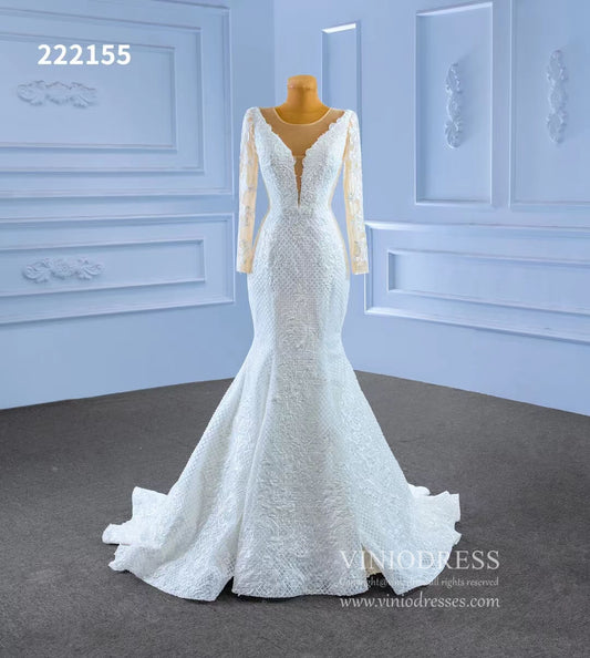 Long Sleeve Lace Mermaid Wedding Dresses with Pearls 222196