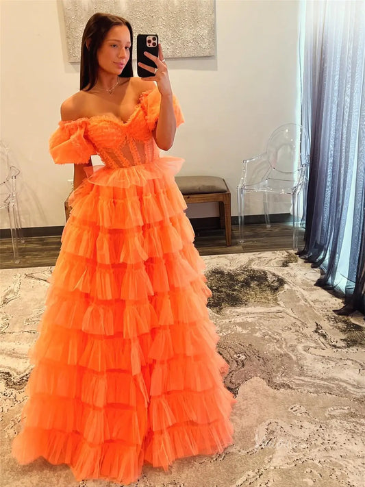 Orange Pleated Tulle Ruffled Prom Dresses with Slit & Puffed Sleeve - FD3747