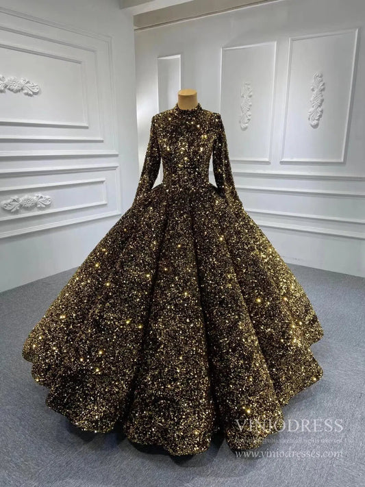 High Neck Beaded Gold Ball Gown Modest Wedding Dress FD67288B viniodress