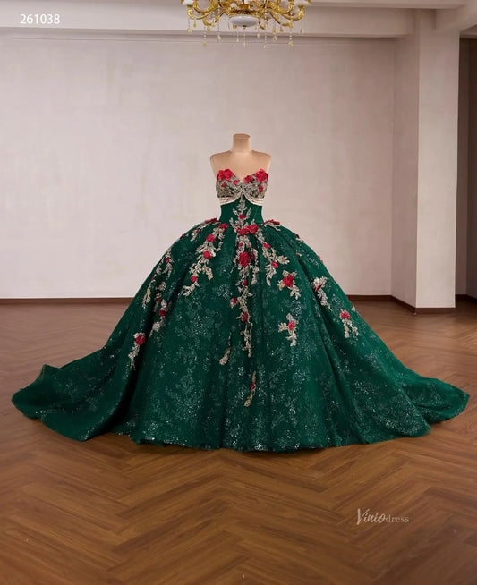 Emerald Green 3D Floral Wedding Dress with Gold Applique Ball Gown and Lace-Up Back - 261038