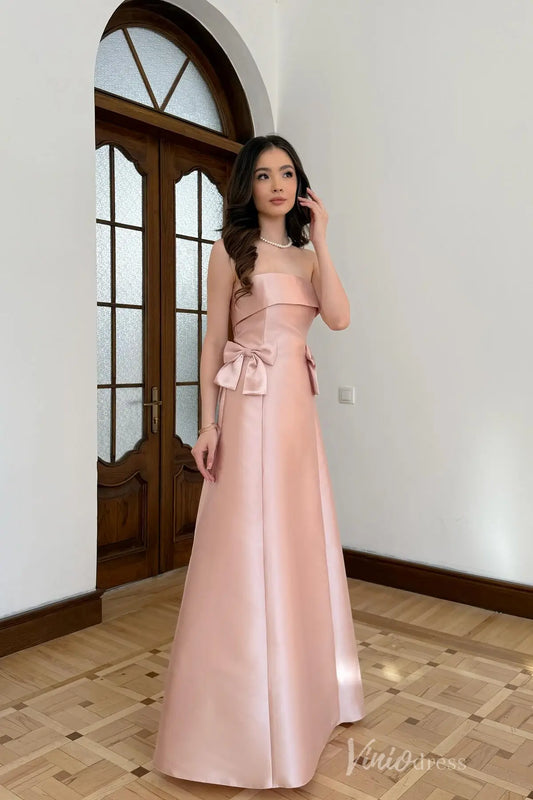 Pink Strapless Mikado Formal Dress with Folded Neckline, Bows, A-Line Silhouette – AS022