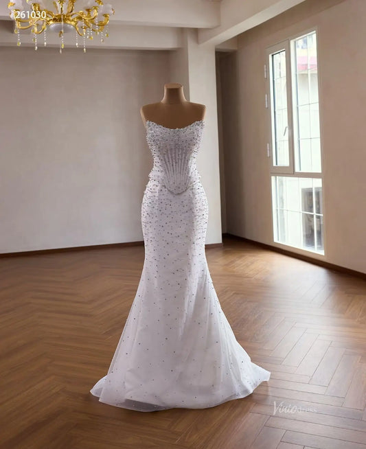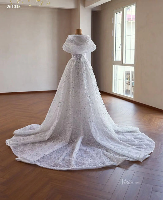White Pearl Beaded Mermaid Wedding Dress with Sheer Corset, Detachable Overskirt & Off Shoulder Sleeves – 261030