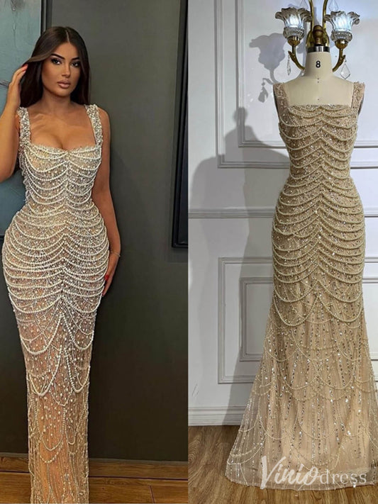 Khaki Beaded String Mermaid Prom Dresses Square Neck Pageant Dress 20220