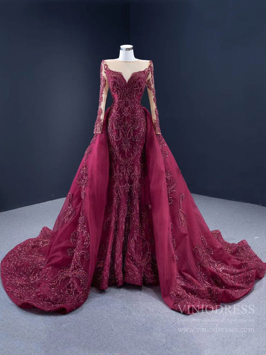 Luxury Beaded Burgundy Formal Dress Long Sleeve Pageant Dresses 67250 viniodress
