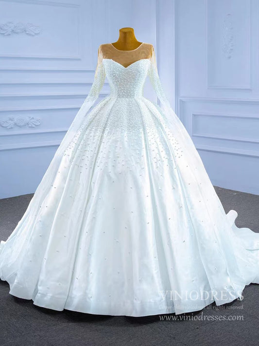 Modest High Neck Pearl Wedding Dresses with Sleeves 67265 VINIODRESS