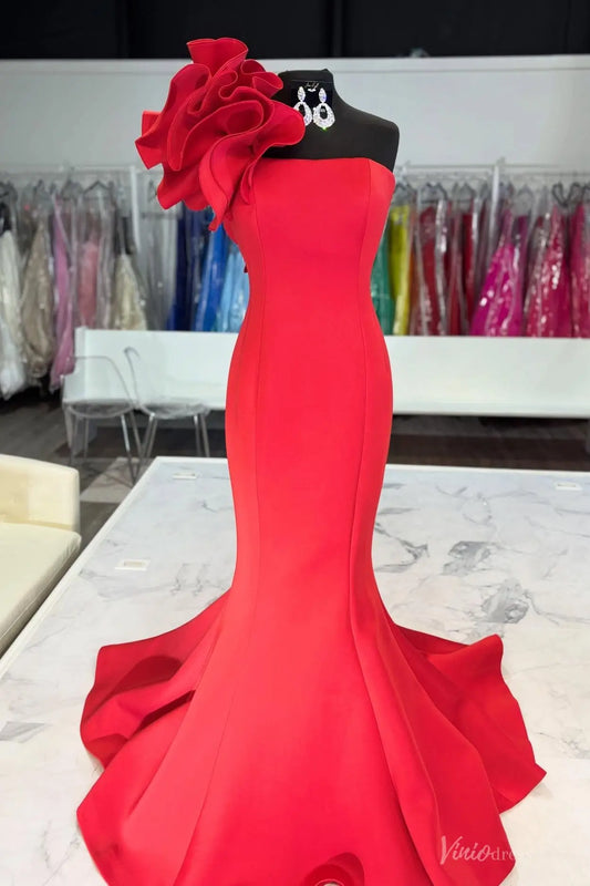 One-Shoulder Satin Mermaid Prom Dress with 3D Ruffle Shoulder & Sweep Train – SS220