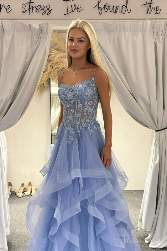 Light Blue Floral Lace Prom Dress with Sheer Corset, Spaghetti Straps & Ruffle Tulle Skirt – LY019