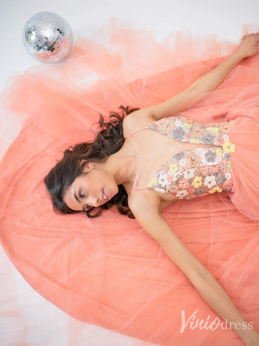 Peach Tulle Prom Dress with 3D Floral Sequin Bodice & Slit – FD6120