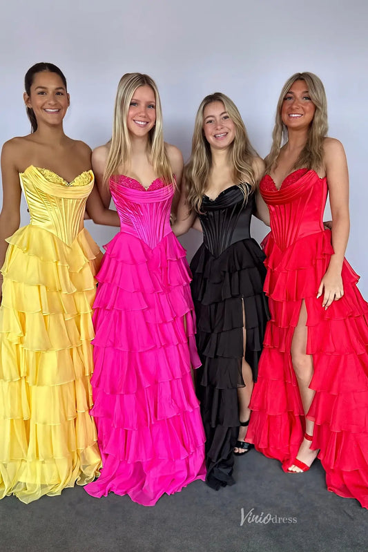 Yellow Strapless Lace Corset Prom Dress with Tiered Ruffle Chiffon Skirt – RF042
