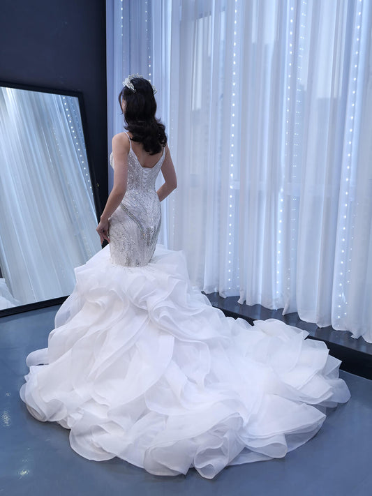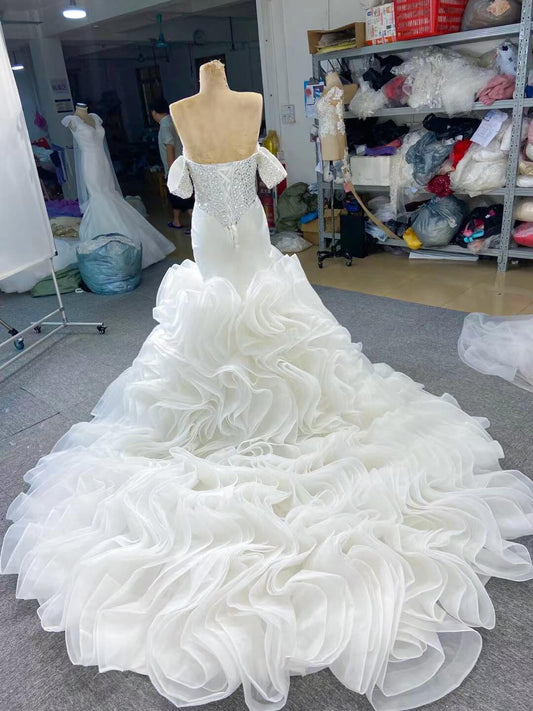 Beaded Ruffle Memraid Wedding Gown with Long Train VINIODRESS