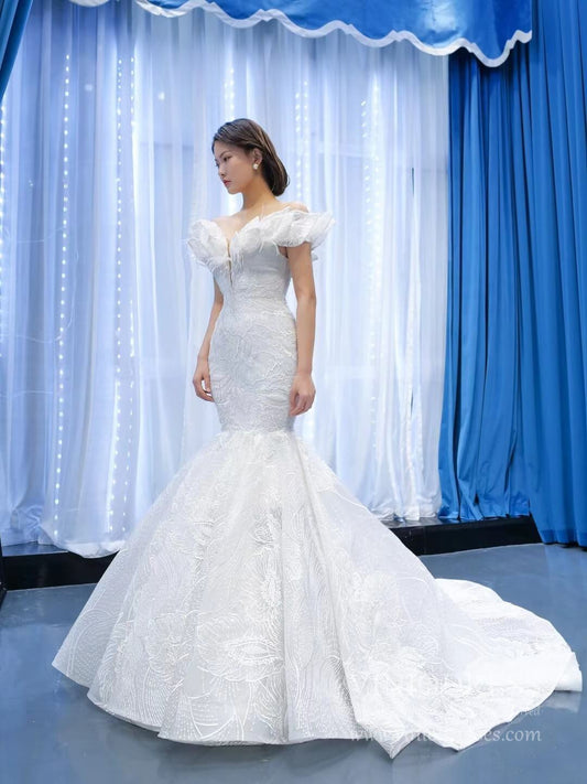 Off the Shoulder Long Sleeve Mermaid Wedding Dresses Ruffled Rosette Skirt VW2035