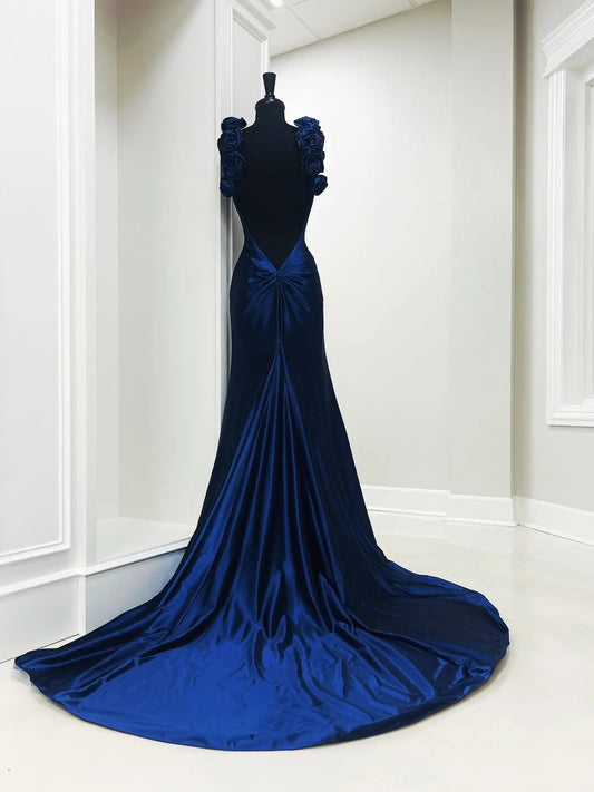 Navy Blue Satin Sheath Prom Dress with 3D Flower, Sweetheart Neckline & Open Back – Style FD6056