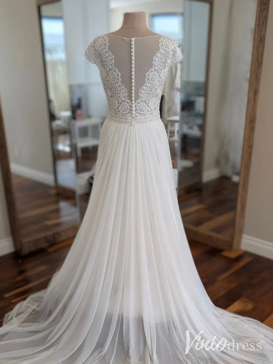 Minimalist Lace Wedding Dress with Cap Sleeve, V-Neck, Tulle Train – LA115
