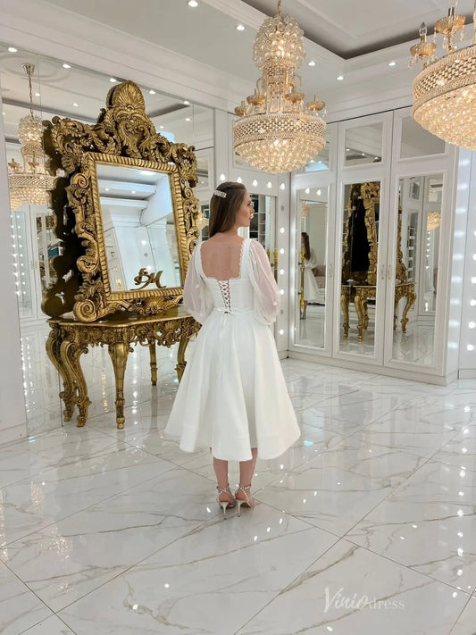 Graceful Ivory Crepe Tea-Length Wedding Dress with Square Neck, Sheer Puff Sleeves & Lace-Up Back – MS127