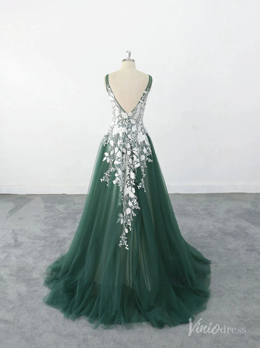 Elegant Emerald Green Wedding Dress with White Lace Appliqués, V-Neckline & Chapel Train – FW235