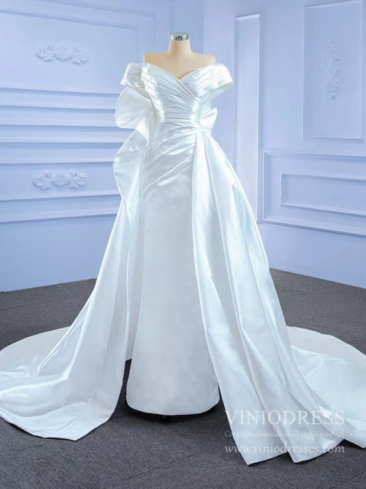Timeless Off-Shoulder Satin Mermaid Wedding Dress with Folded Neckline & Button Train – MN138