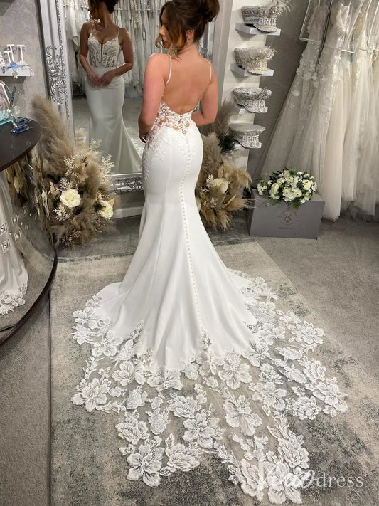 Elegant Floral Lace Mermaid Wedding Dress with Sheer Bodice, Spaghetti Straps & Chapel Train – MN137