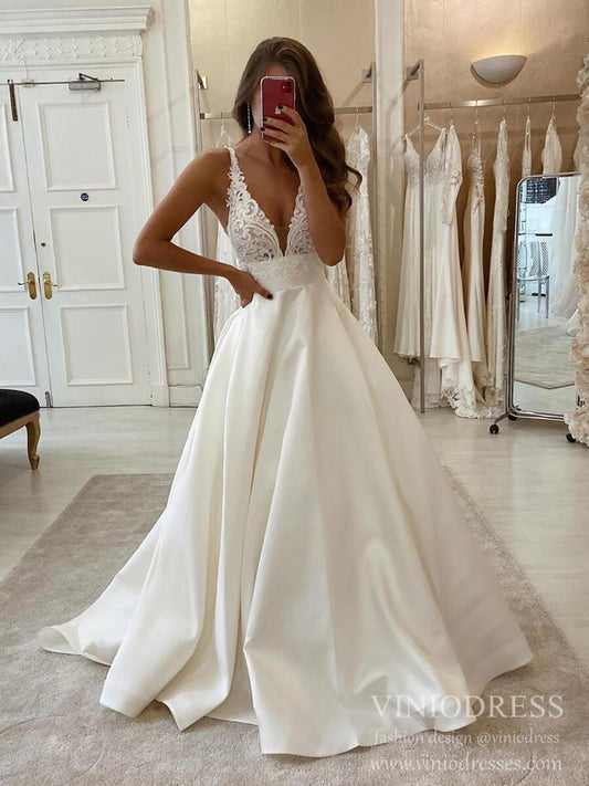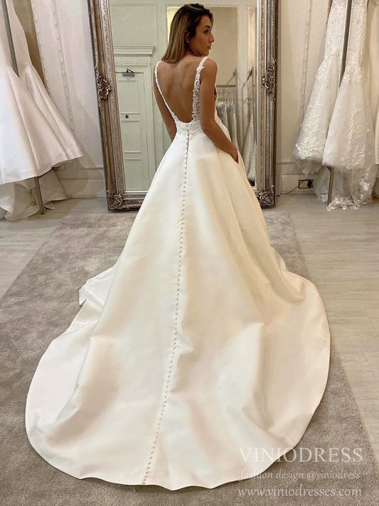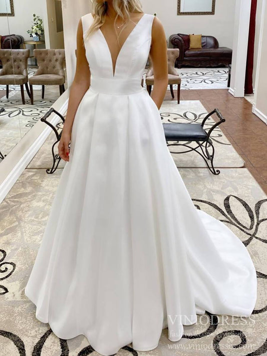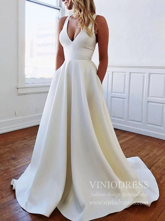 V Neck Simple Satin A-line Wedding Dress with Pockets | Minimalist Modern Bridal Gown VW1180