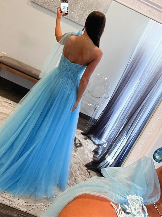 Blue Lace Tulle Prom Dresses with Bow One Shoulder & Sit - FD5186