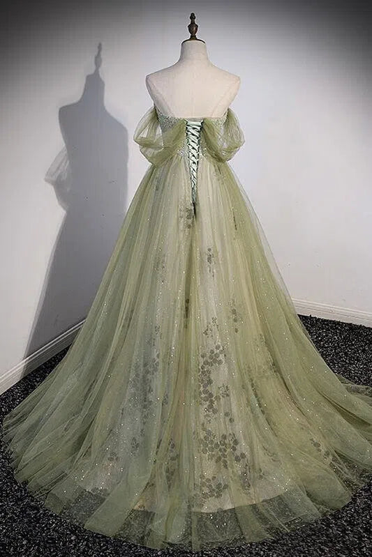 Light Green Tulle Prom Dresses Beaded Lace Evening Gowns FD3570