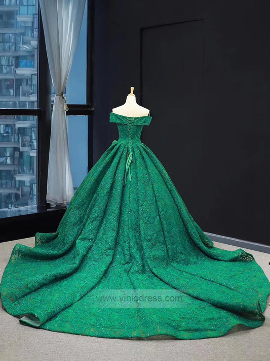 Emerald Green Lace Princess Prom Dresses Modest Ball Gowns FD1302 viniodress