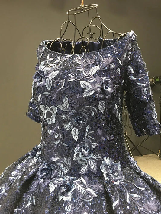 Elbow Sleeve Navy Blue Vintage Quinceanera Dress 3D floral Detut Dresses FD1198B viniodress