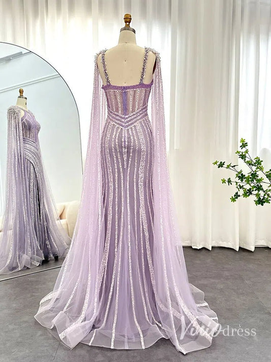 Lilac Beaded Mermaid Evening Dresses with Slit Cape Sleeve Pageant Dress AD1148