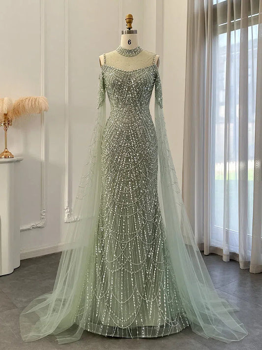 Light Green Mermaid Prom Dresses Beaded Puff Sleeve Evening Dress 20095