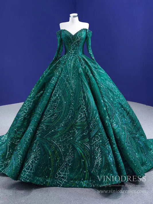 Emerald Green Sequin Lace Ball Gown Long Sleeve Wedding Dress 67368 viniodress