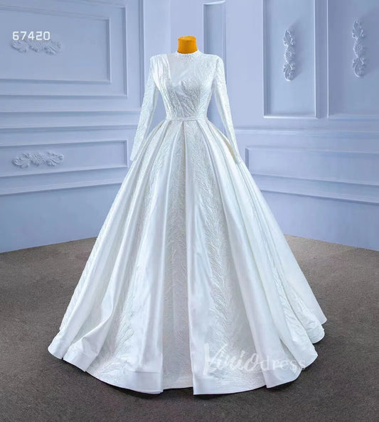 Long Sleeve Beaded Satin Wedding Dress High Neck 67420