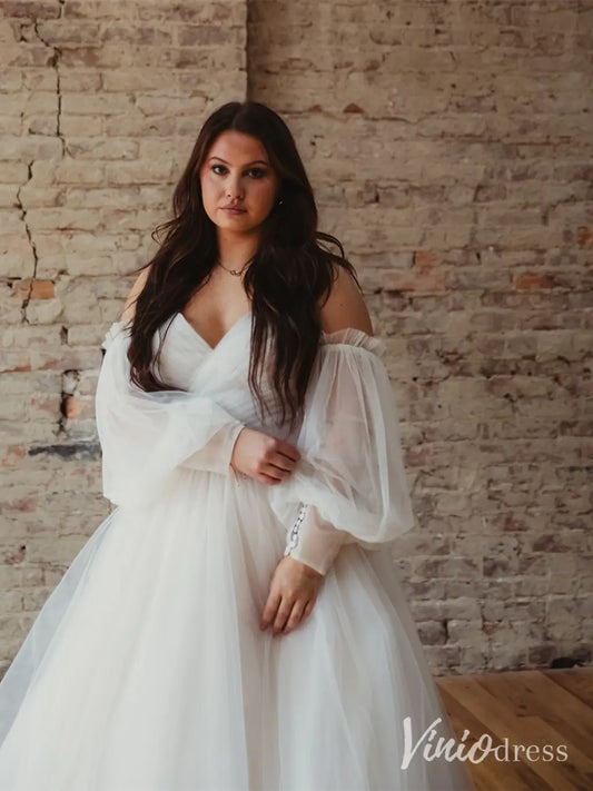 Plus Size Goddess Tulle Ball Gown Wedding Dress with Removable Puff Sleeves, Chapel Train – MS103