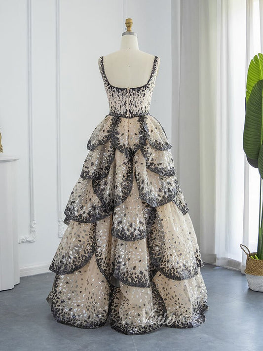 Beaded Black Layered Prom Dresses Champagne Square Neck Evening Gown 20099