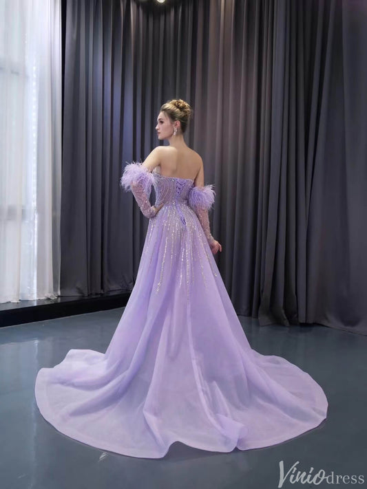 Beaded Lavender Prom Dresses Overskirt Wedding Dress with Slit,Removable Long Sleeves 241100