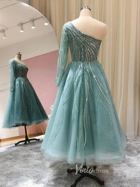 Beaded Light Green Tea Length Evening Dress One Shoulder Long Sleeve Prom Dress 20096