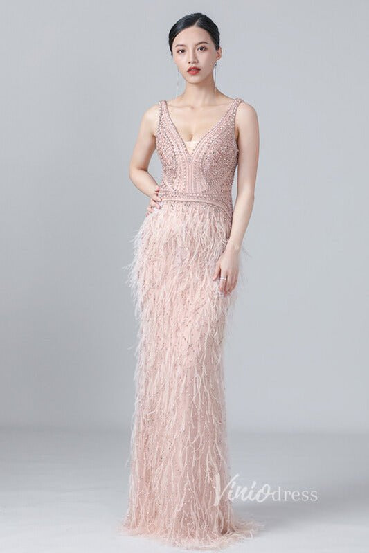 Pink Beaded Feather Mermaid Prom Dresses V-neck FD2614