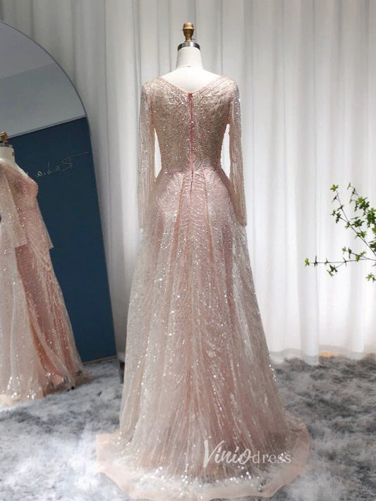Rose Gold Lace Prom Dresses Long Sleeve Beaded Evening Dress 20085