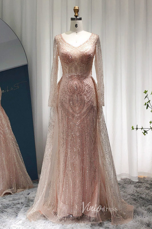 Long Sleeve Pink Beaded Lace Prom Dresses Overskirt Evening Dress 20089