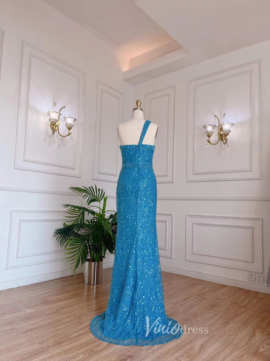 Shimmer Ocean Blue Prom Dresses Beaded Sequin Evening Dress 20074