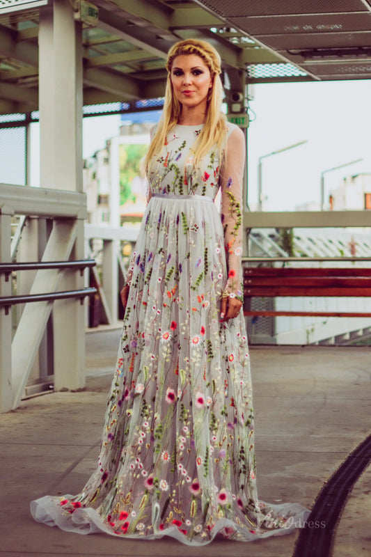 Whimsical Meadow Floral Wedding Dress with Long Sleeves| V-Neck Backless Gown FW101