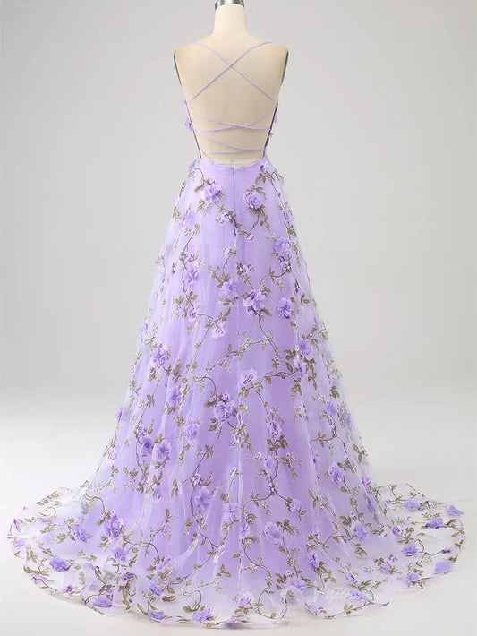 Lavender Flower Blossom Prom Dresses Spaghetti Strap Floral Formal Dresses FD3805