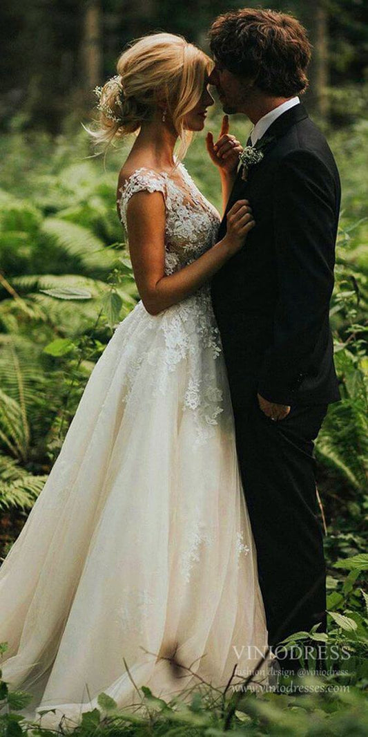 A-line Tulle Lace Country Wedding Dresses Backless Bridal Dress VW1545