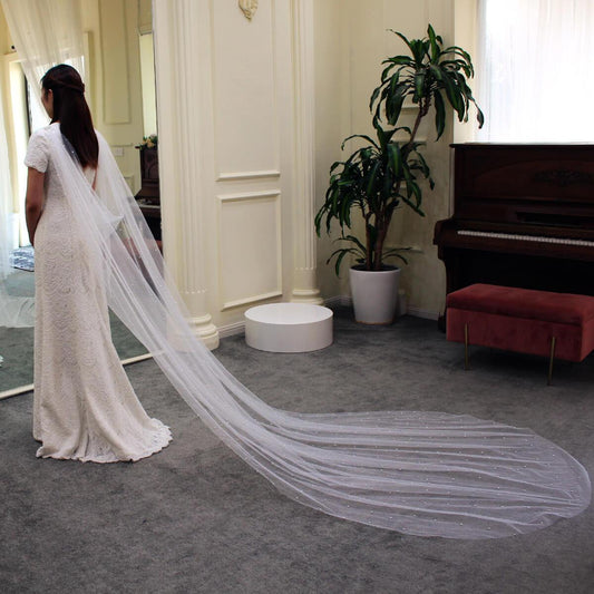 Velo largo brillante de tul con perlas para novias Viniodress V873