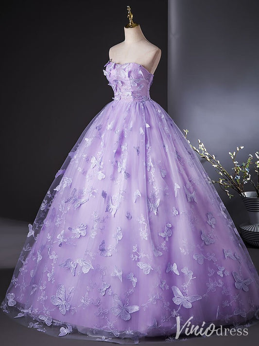 Vestido de quinceañera sin tirantes con apliques de encaje de mariposa color lavanda AD1386