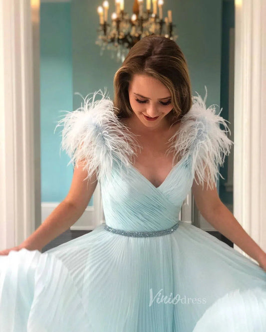 Vestido de fiesta azul claro con un hombro descubierto y abertura, vestido formal de baile FD2702