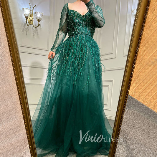 Vestidos de fiesta de plumas verdes de manga larga Vestidos de noche azules con cuentas 20004