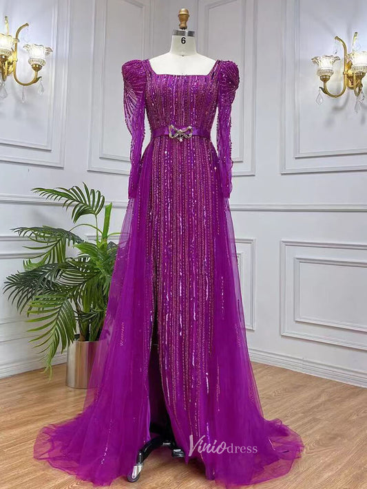 Vestidos de fiesta magenta de manga larga Vestido de noche con cuello cuadrado morado y hendidura 20048